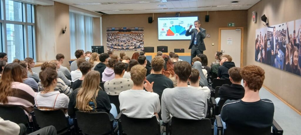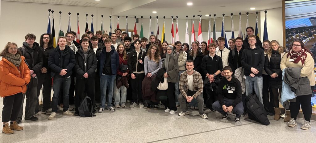 Vom 3. bis 5. Februar 2026 nahmen die Sowi-Kurse der Q1 des Silverberg-Gymnasiums am Planspiel „Destination Europe“ der Karl-Arnold-Stiftung teil. Im Mittelpunkt stand die europäische Migrations- und Flüchtlingspolitik – zunächst im Rahmen eines zweitägigen Planspiels, anschließend bei einer Exkursion nach Brüssel. Nach einer Einführung in die Institutionen und Entscheidungsprozesse der Europäischen Union schlüpften die Schülerinnen und Schüler selbst in die Rollen politischer Akteurinnen und Akteure. In intensiven Debatten, Verhandlungen und Abstimmungen erlebten sie, wie komplex europäische Politik ist und wie schwierig es sein kann, gemeinsame Lösungen zu finden. Die abschließende Reflexion zeigte: Kompromisse sind in der EU unerlässlich – und oft hart erarbeitet. Den Höhepunkt bildete die Tagesfahrt nach Brüssel. Zunächst besuchte die Gruppe das Europäische Parlament. In einem interaktiven Vortrag erhielten die Schülerinnen und Schüler Einblicke in die Arbeit des Parlaments und seine Rolle im Institutionengefüge der EU. Besonders beeindruckend war die Besichtigung des Plenarsaals. Anschließend ging es in das Haus der Europäischen Geschichte, wo die Entwicklung Europas vom 20. Jahrhundert bis zur heutigen Europäischen Union anschaulich dargestellt wird. Die Ausstellung verdeutlichte eindrucksvoll die historischen Wurzeln und die Bedeutung der europäischen Einigung. Die Rückfahrt dauerte dann ziemlich lange, die Stimmung war jedoch dennoch im ganzen Bus hörbar gut. Trotzdem waren nach einem langen Tag alle froh, gegen 21 Uhr wieder wohlbehalten in Bedburg angekommen zu sein. Begleitet wurden die Kurse von Herrn Paeßens, Frau Pourrezhaie und Herrn Wissing. Die Exkursion bot eine wertvolle Ergänzung zum Unterricht und ermöglichte es den Schülerinnen und Schülern, europäische Politik nicht nur theoretisch zu behandeln, sondern vor Ort zu erleben.“