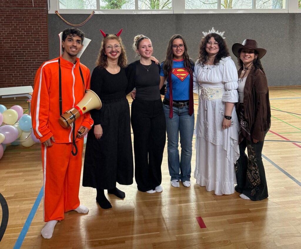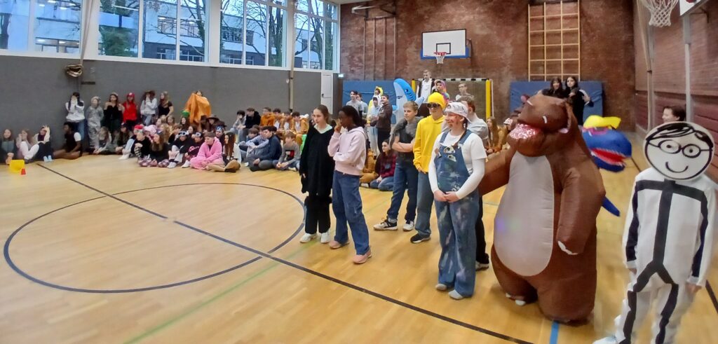 An Weiberfastnacht sorgte außerdem die Schülervertretung (SV) für ausgelassene Karnevalsstimmung. Auf Wunsch der SchülerInnen unserer Schule organisierte die SV eine Karnevalsveranstaltung speziell für die 7. und 8. Klassen, die in der ersten und zweiten Pause, parallel zur Karnevalsveranstaltung der 5er und 6er Klassen, in der Eichendorfhalle stattfand. In der ersten Pause stand alles im Zeichen von Musik und Kreativität. Die Klassen nahmen an einem lustigen Liederraten teil und präsentierten stolz ihre fantasievollen Karnevalskostüme. Besonders kreative Verkleidungen wurden von der SV ausgewählt und gefeiert. Auch die zweite Pause hatte ein echtes Highlight zu bieten: Die SchülerInnen traten in einem spannenden Parcours gegen Herrn Logmin und Frau Dietrich an. Mit viel Teamgeist und guter Laune konnten die SchülerInnen den Wettkampf für sich entscheiden – und das gleich zweimal! Zum krönenden Abschluss der Veranstaltung wurde das beste Karnevalskostüm ausgezeichnet. Die Gewinnerin oder der Gewinner durfte sich über einen Gutschein für die Mensa freuen. Die Karnevalsaktion war ein voller Erfolg und sorgte für viel Spaß, Bewegung und gute Laune im Schulalltag. Ein großes Dankeschön an die SV für die tolle Organisation! Frau Lausberg und Frau Pourrezaie
