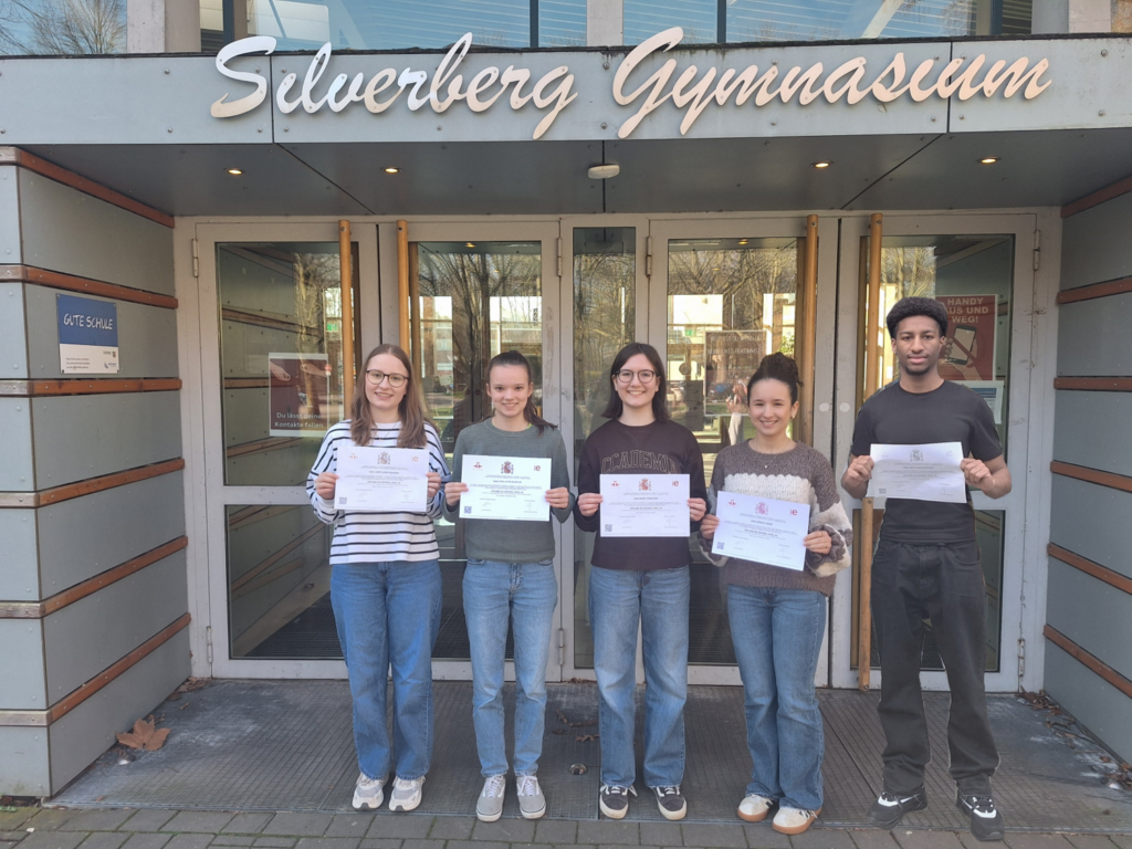 Dieses Jahr haben wieder vier Schülerinnen und ein Schüler ihr DELE-Zertifikat erhalten, welches ihnen ihre Spanischkenntnisse international anerkannt bestätigt. Sie haben sich von Januar bis November 2025 in der DELE-AG unter Leitung von Frau Eckrich und Frau Schleenvoigt vorbereitet, um die Prüfungsinhalte zu üben. Die DELE-AG findet auch aktuell wieder statt und freut sich immer über die nächsten Interessenten.